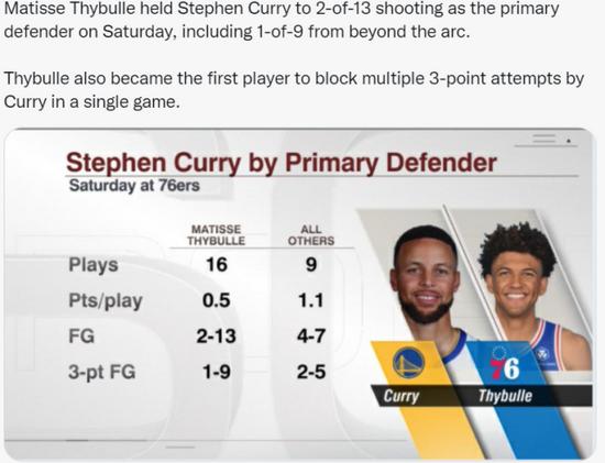 北京时间12月12日,金州勇士以93-102不敌费城76人,本场比赛中,在塞布尔的防守下,库里不仅没能够破纪录,球队也是输球。同时,美媒统计了一项关于塞布尔的数据,体现了他对库里的防守能力。