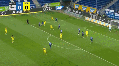 第40分钟,霍芬海姆获得绝佳反击机会,吕特获得单刀赴会,克拉马里奇快速跟进。杀入禁区后,吕特面对出击的科贝尔,尝试把球传给位置更好的克拉马里奇,皮球却被回防到位的阿坎吉一脚破坏出底线,霍芬海姆错过扳平机会。