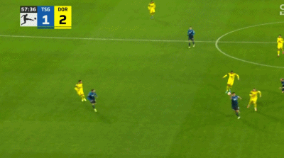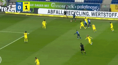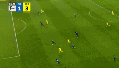 第67分钟,多特蒙德扩大了领先优势,1-3。多特蒙德前场踢出配合,马伦沿着左路杀入禁区起脚传中,中路跟进的小阿扎尔高速压上,霍芬海姆中后卫劳姆抢先一脚试图解围,但他不慎自摆乌龙,多特蒙德客场大比分领先霍芬海姆。
