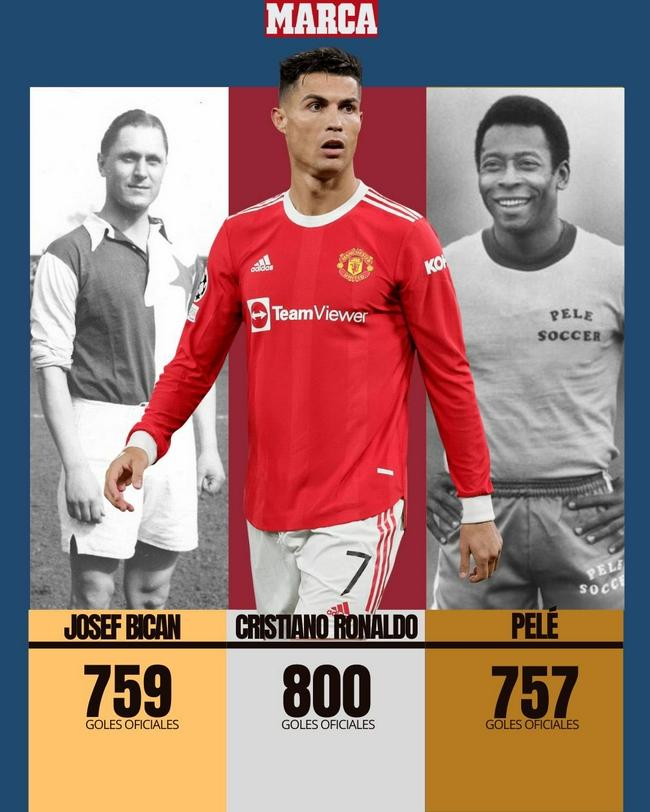 C罗成为了职业足球历史上首位正式比赛进球超过800个的球员。