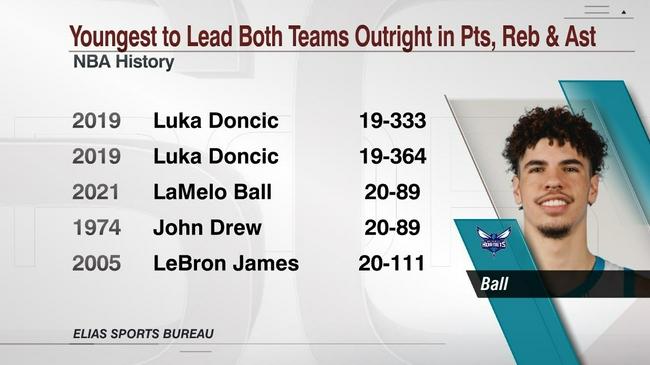 除此之外,三球在自己20岁零89天时完成了得分、篮板和助攻三项数据领跑全队的成就,追平了前辈约翰-德鲁,成为NBA历史上第二年轻完成这样殊荣的球员。