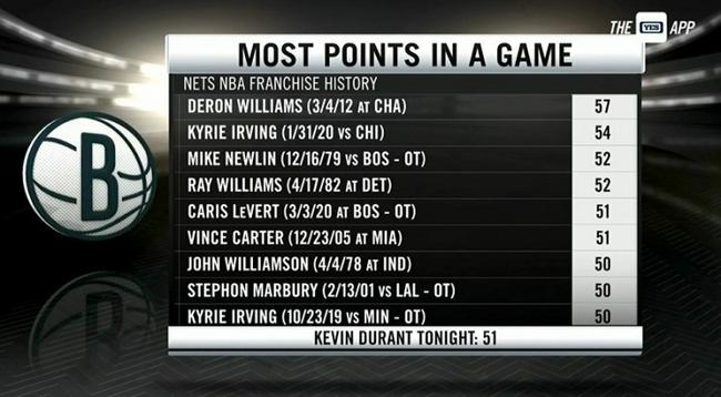 KD成第9位单场得分50+的篮网球员 欧文曾有2场