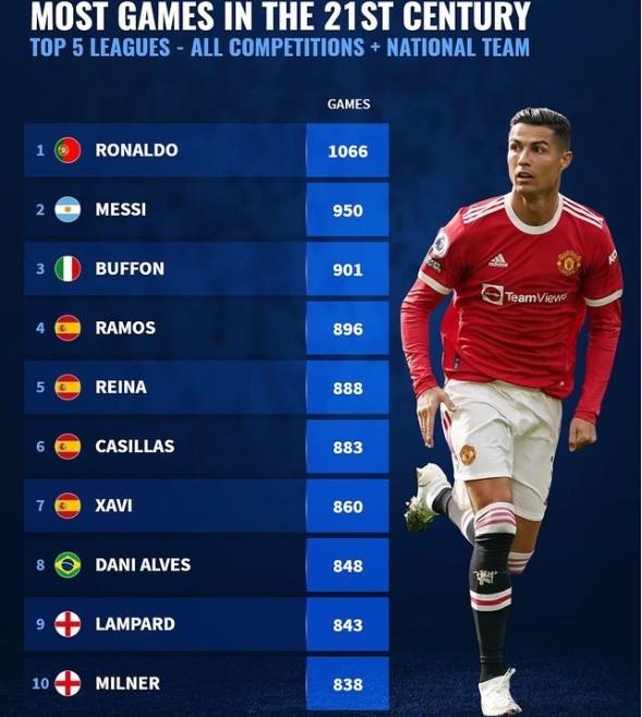 新世纪五大联赛各项赛事+国家队出场榜:C罗榜首