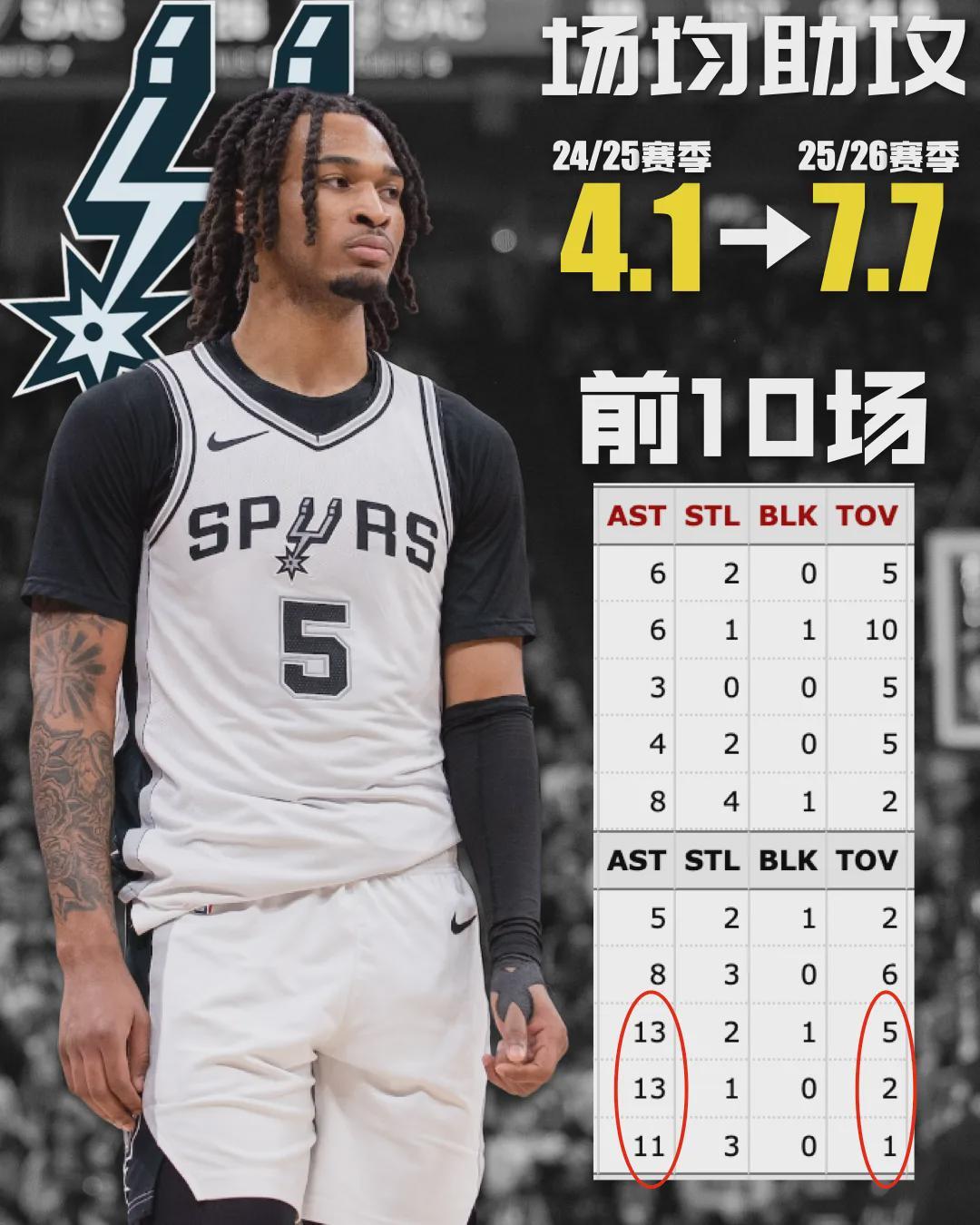 随着赛季深入以及卡斯尔状态渐入佳境,他的助攻失误比只会越来越好看。这是卡斯尔优秀的比赛内容支撑的事实,如果你有关注马刺队的比赛,你会发现卡斯尔在场上处理球的成熟度,远不像失误次数那样离谱。相反,你会觉得这个21岁的年轻人举重若轻。虽然马刺有文班这个怪物,但在文班身边打控卫,可不只是把球丢掉天上等他扣进去那么简单......因此,马刺新任主帅米奇-约翰逊才愿意把球权都交到他手上支配,让他去发号施令。