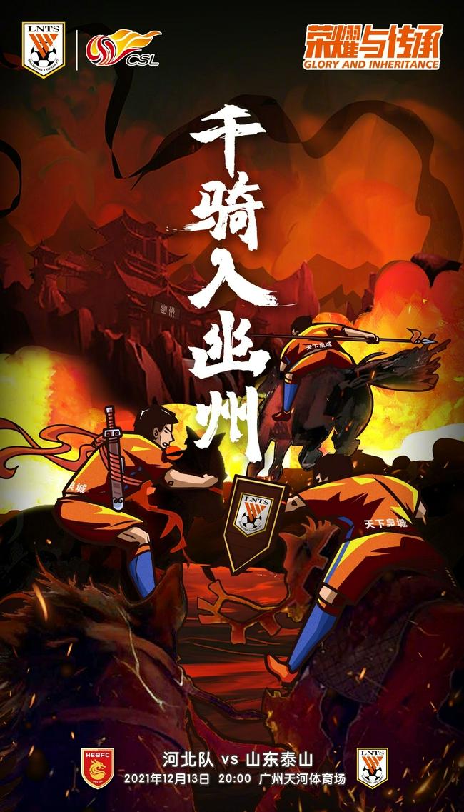 12月13日晚,中超第二阶段争冠组即将开战,山东泰山首战河北队,赛前泰山队发布海报“千骑入幽州”,展现出泰山队誓要拿下比赛的决心,而此前陷入困境的河北队的赛前海报主题为“无惧前路,坚持到底”。