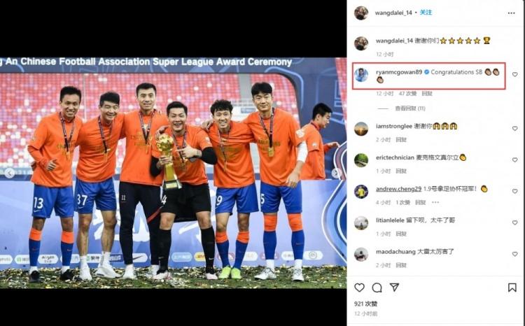 北京时间1月5日讯 代表泰山队捧起中超冠军奖杯后,王大雷在社交平台晒照,前队友麦克格文也来留言祝贺。