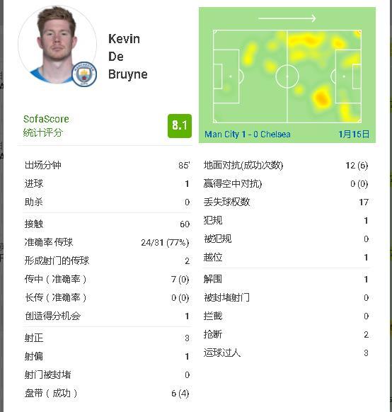 德布劳内此役踢了85分钟,4次射门打入1球。他60次触球,31脚传球,24次到位。2次创造得分良机,6次盘带4次成功。