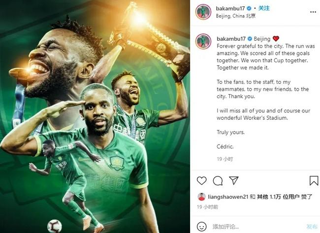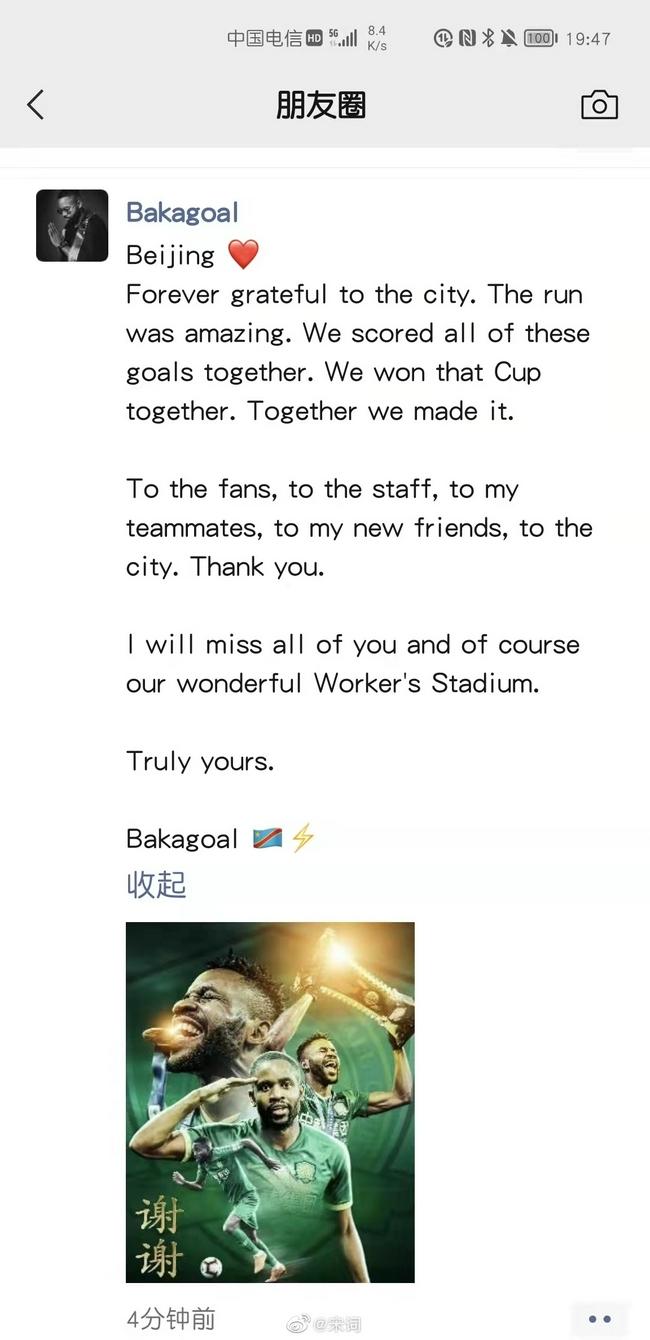 巴坎布朋友圈:感激这座城市 会想念所有国安人